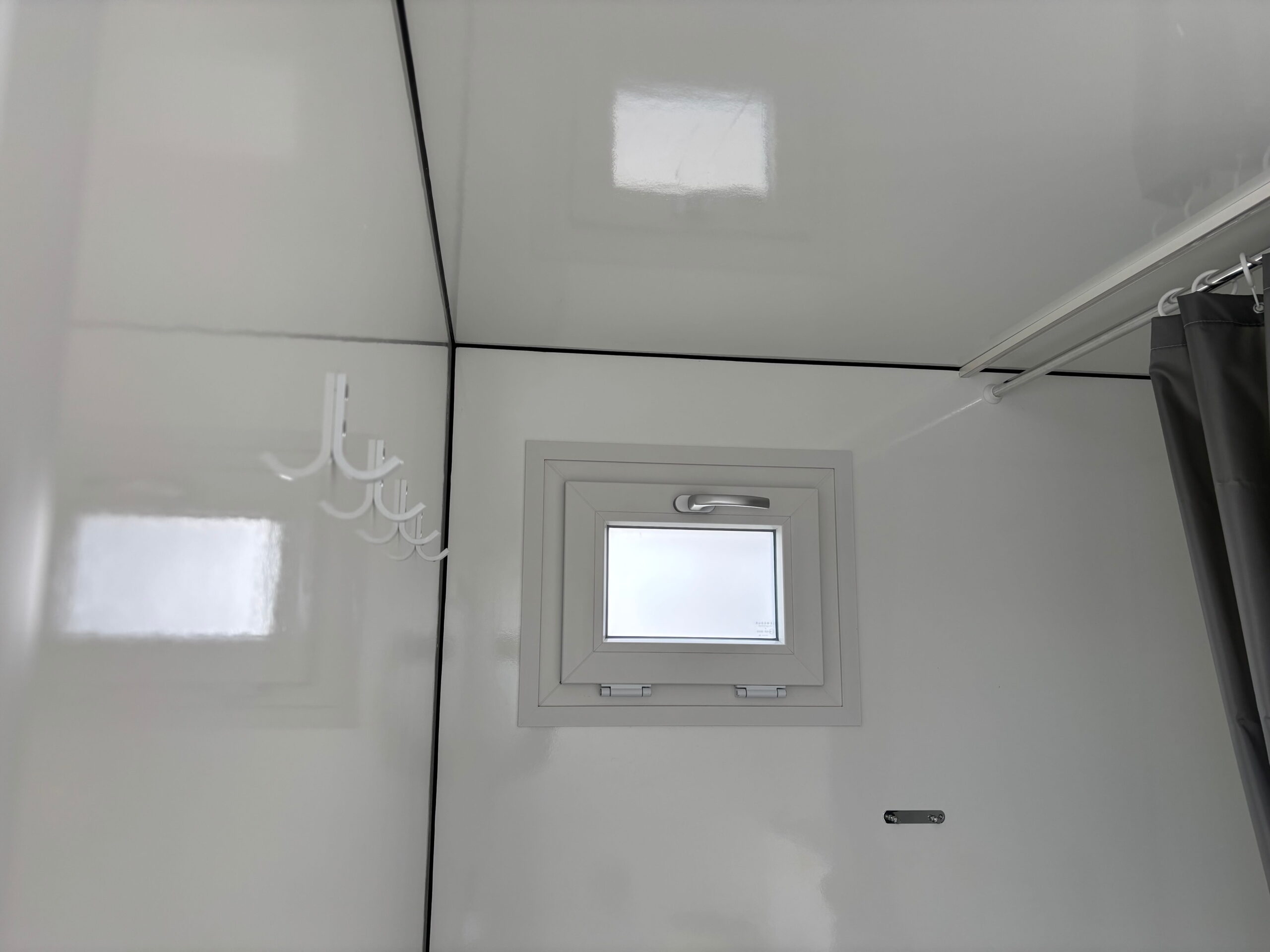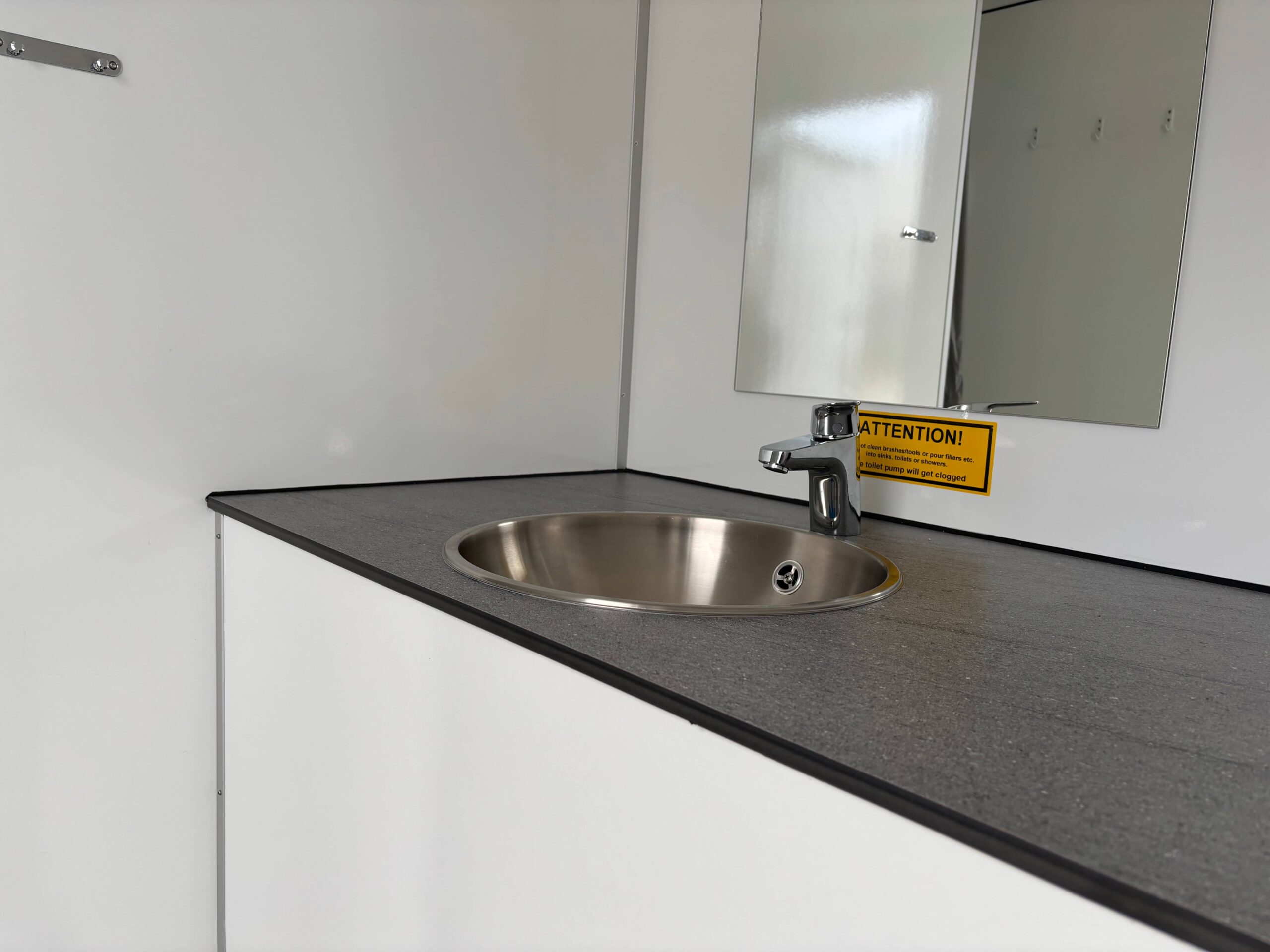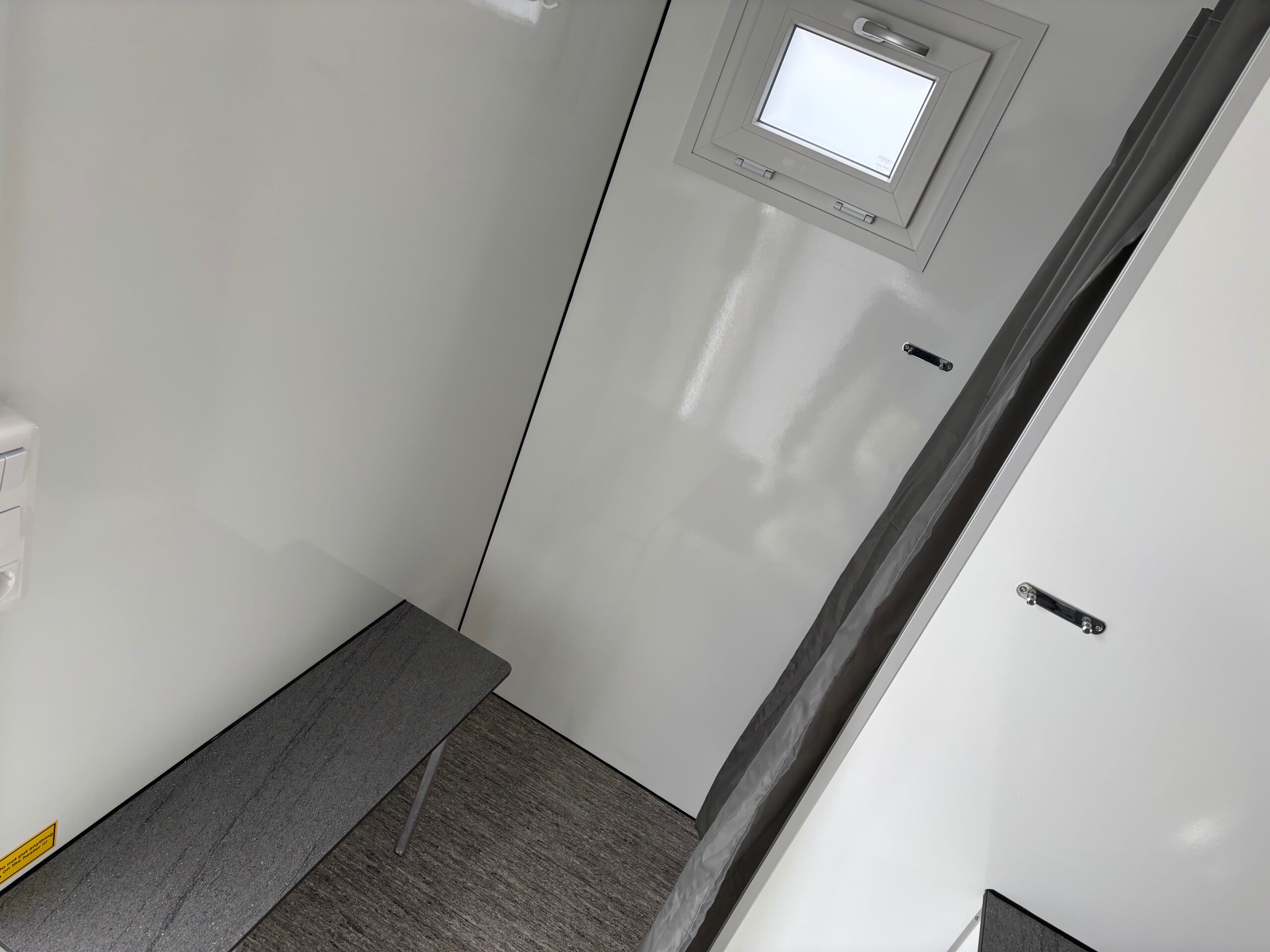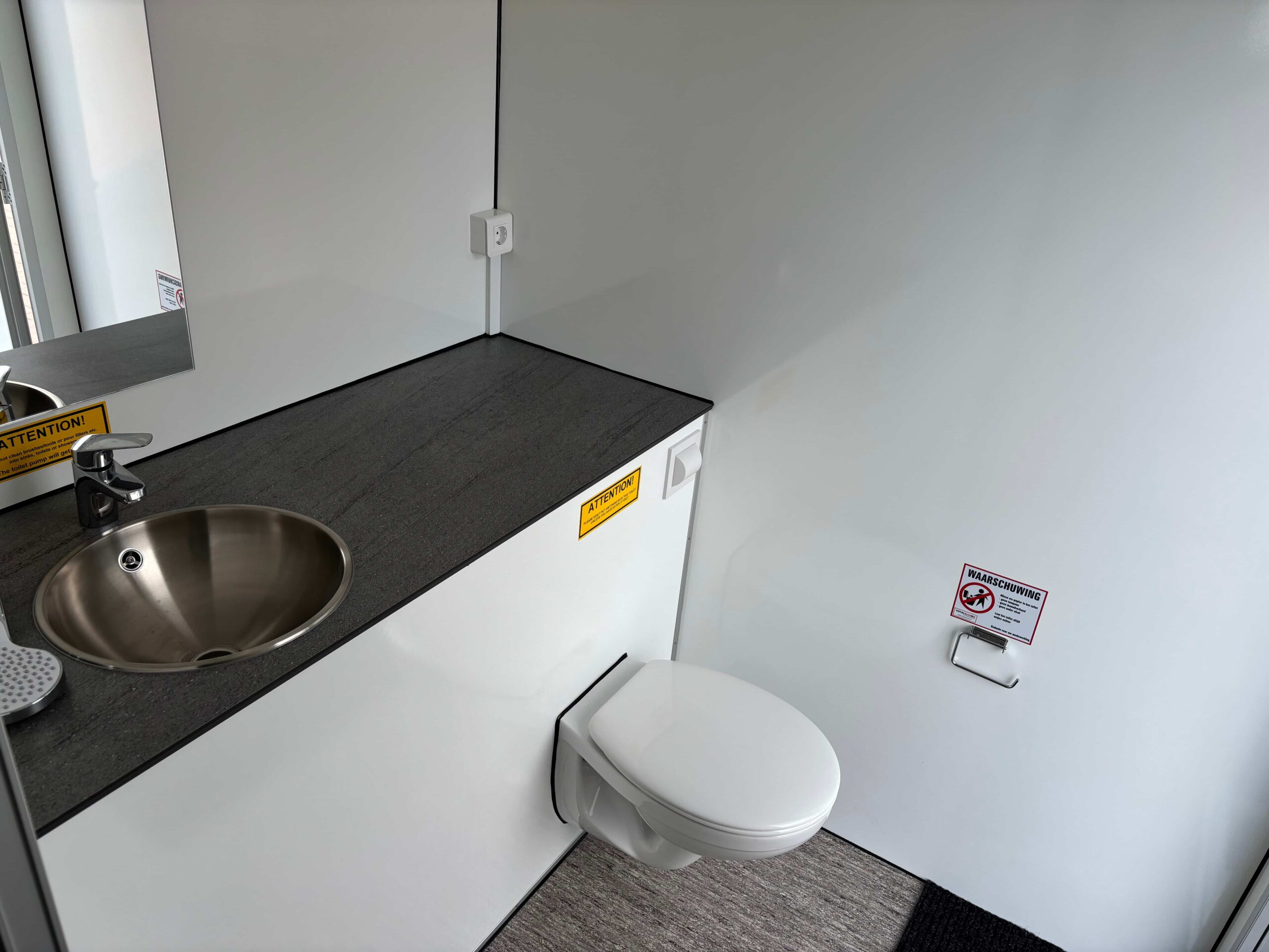 De unit is van alle gemakken voorzien: een comfortabele douche, een wastafel met spiegel en een modern hangend toilet. Dankzij het praktische douchegordijn blijft het gedeelte waar u zich omkleedt netjes droog. Zo blijft uw dagelijkse routine tijdens de verbouwing moeiteloos behouden.